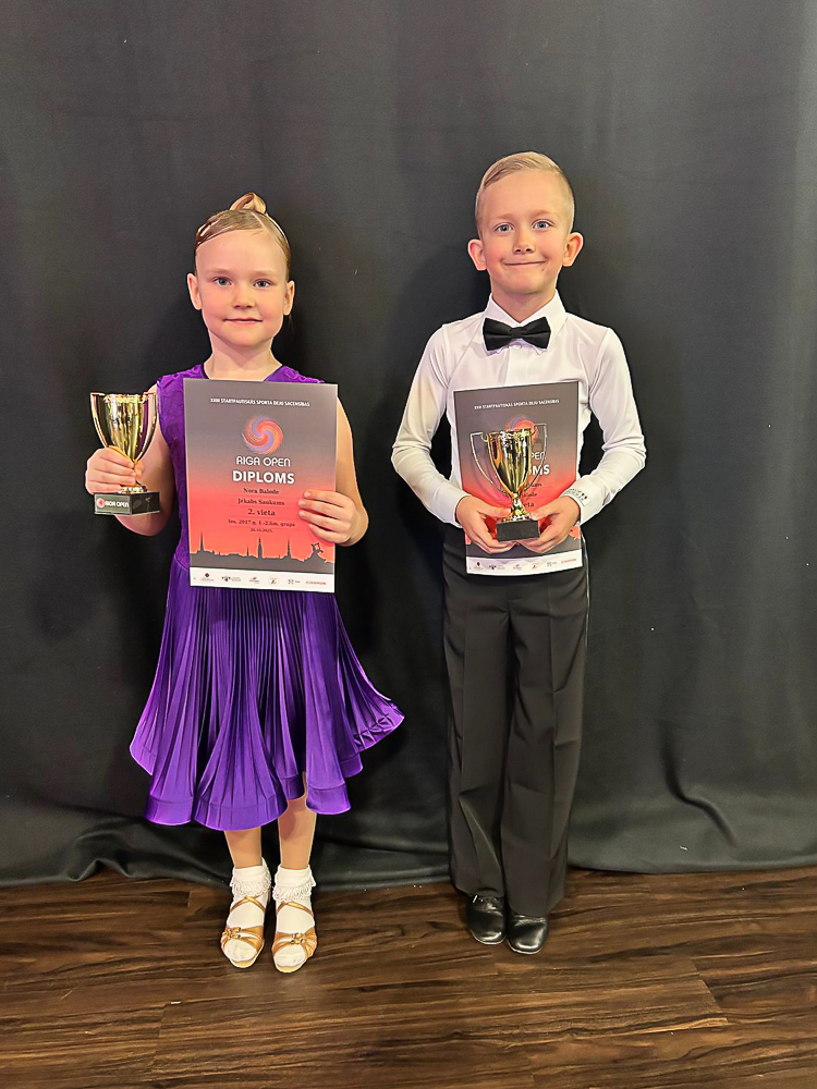 Iesācēju grupas dejotāji Jēkabs un Nora startēja Iesācēji (Bērni I) 2017.g. un jaunāki 1.-2.līmenis 3 dejas sacensībās un izcīnīja 2.vietu.